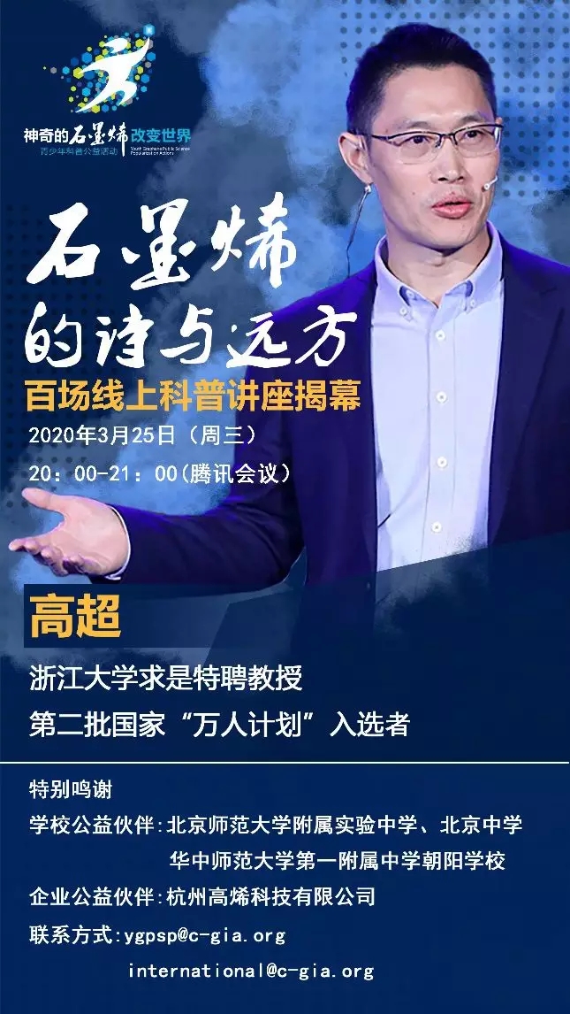 高烯科技创始人兼首席科学家,浙江大学高超教授亲自担任讲座嘉宾。3月25日,高超教授将以网络直播的形式,为北京师范大学附属实验中学、北京中学、华中师范大学第一附属中学朝阳学校的同学们做《石墨烯的诗与远方》主题讲座。云端授课,以参与石墨烯青少年科普工作践行作为科学家和实业家的社会责任,彰显了高烯科技的首创(first)理念。